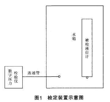 該檢定裝置如圖1所示,包括數字壓力校驗儀、水箱、連通管、水箱、各種液位計接口和固定裝置。