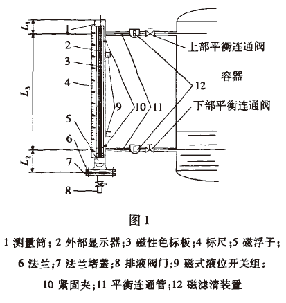 1測量筒;2外部顯示器;3磁性色標板;4標尺;5磁浮子;6法蘭:7法蘭堵盞;8排液閥門;9磁式液位開關(guān)組;10緊固夾;11平衡連通管;12磁濾清裝置元件上磁性材料的作用而發(fā)生翻轉(zhuǎn)。翻板或翻柱上涂有兩種視覺區(qū)分較大的顏色,觀看液位顯示器中翻板或翻柱的顏色分界線就可知容器中液位的情況。測量筒垂直方向的上下兩端安裝有閥門,其中上閥門用于平衡氣壓,下閥門用于放走殘留液體。