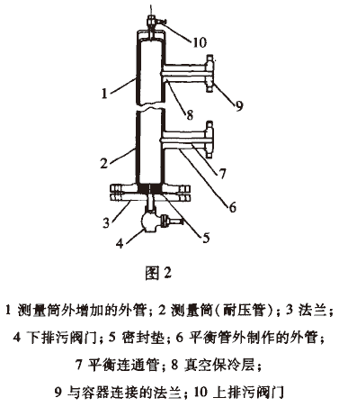 在原有的液位計結(jié)構(gòu)基礎(chǔ)上,在測量筒外增加一真空保溫層。由于測量筒中的液體跟容器中的液體是相同的,故測量筒外的真空保溫層阻隔了測量筒內(nèi)的低溫液體與外界空氣的溫度影響。實踐證明。此項改進確實起到了良好的隔溫作用。但此結(jié)構(gòu)在實際裝置運行中,平衡連通管周圍會凝結(jié)出大量冰塊。通過分析,由于測量筒與容器間是通過上下兩根平衡管相連接的,在液位計可正常指示時,下平衡管中始終充滿低溫液體。因在測量筒外增加的真空保溫層不能阻隔平衡管與外界的直接接觸,故在平衡管四周還是會出現(xiàn)大量的冰塊。