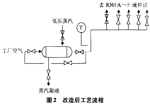 此次試驗的成功為徹底解決乙烯球罐磁翻板結冰提供了寶貴的經驗,因此將試驗期間所用的臨時管線和設備經過進一步完善,于2016年4月底完成全部乙烯球罐(R301A-F)耐酸堿磁翻板液位計的改造,液位計上的空氣吹掃管為自制設備,進氣端裝一閥門用于調節空氣量,另一端封閉,在靠進液位計翻板側每間斷開5cm一個中的孔用于空氣吹掃為保證吹掃空氣的溫度在加熱器出入口增加一旁線,流程見圖2。