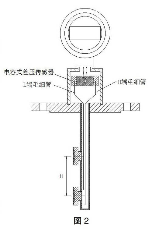 我們設(shè)想用差壓原理,將差壓高壓端(H端)做出充油的毛細(xì)管和受壓膜盒,毛細(xì)管加膜盒長度為從帶壓容器上的連接器到容器底部;差壓變送器低壓端(L端)也做一個(gè)膜盒,膜片直徑同高壓端的膜盒。這個(gè)膜盒置于上端的容器內(nèi),連接器下,也可以置于連接上邊的封閉腔室內(nèi),封閉腔室與連接器(法蘭)上有差壓傳感器低壓端引壓孔,與被測容器相連。用以自動(dòng)減去容器內(nèi)壓力。為了使差壓變送器高低端由于真空下充灌硅油等導(dǎo)壓介質(zhì)對差壓造成的誤差盡可以少,將低壓端的毛細(xì)管做成與高壓端等長,毛細(xì)管下端封閉。這樣,雙向毛細(xì)管所產(chǎn)生的壓力幾乎相等,產(chǎn)生差壓幾乎為零。這樣設(shè)計(jì)還有另外一個(gè)重要功能,就是,無論充填什么樣的導(dǎo)壓介質(zhì),都要產(chǎn)生膨脹與收縮,只要有溫度變化,這種變化就有,由于雙向等長等容,兩個(gè)膜盒幾乎處于同一溫場,這種溫度變化產(chǎn)生的影響可以自動(dòng)抵消,由充填導(dǎo)壓介質(zhì)產(chǎn)生的誤差很小。