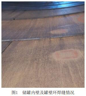 儲罐結構型式為拱頂罐,罐壁的環焊縫為搭接結構,其罐壁的焊縫均沒有進行處理,有一定的焊縫余高,罐體內直徑隨著高度的增加直徑在變小。儲罐原為原油儲罐,雖然經過蒸汽吹掃,罐壁上仍附著油污,罐內的防腐層破壞嚴重。儲罐在制造時,對鋼板的內表面要求處理的粗糙度等級不高,使內壁殘留許多小的焊瘤、焊渣等,該類殘留物部分有鋒利的銳角。其具體情況如圖1所示。