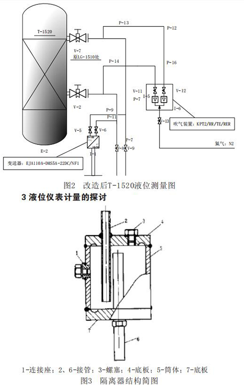 對(duì)溶劑吸收工段吸收塔T-1520進(jìn)行儀表改造,拆除原就地醋酸液位計(jì),在原就地液位計(jì)處增加一套反吹法測(cè)量設(shè)備。增加的儀表有:普通磁性浮子液位計(jì)1臺(tái):EJA110A-DMS5A-22DC/NF1、反吹風(fēng)裝置1套、球閥(DN10)3只,¢14不銹鋼管等。圖2為技術(shù)改造后的反吹法測(cè)量液位的安裝效果圖。