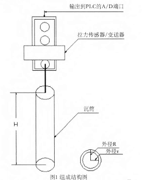 沉筒式液位計主要由拉力傳感器、變送器及沉筒組成,拉力傳感器內(nèi)部貼有電阻應(yīng)變片,通過信號線將變送器輸出的標(biāo)準(zhǔn)電流信號送到PLC的A/D輸入端口,用以進行數(shù)據(jù)處理和遠程控制。沉筒由上下兩端封閉的空心材料制成,并懸掛在拉力傳感器的受力端,其余部分投入到儲料罐中,拉力傳感器用法蘭盤或自帶螺紋固定在儲料罐的上方,結(jié)構(gòu)如圖1所示。