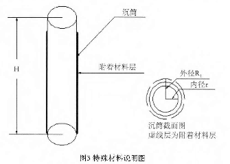 當(dāng)材料本身有粘附性和凝固性時,沉筒的表明會附著一層或幾層材料,導(dǎo)致其體積發(fā)生變化,自身的重量也發(fā)生變化,其變化如圖3所示,其中沉筒截面積中虛線層為附著材料層,設(shè)此時沉筒外徑為R1。