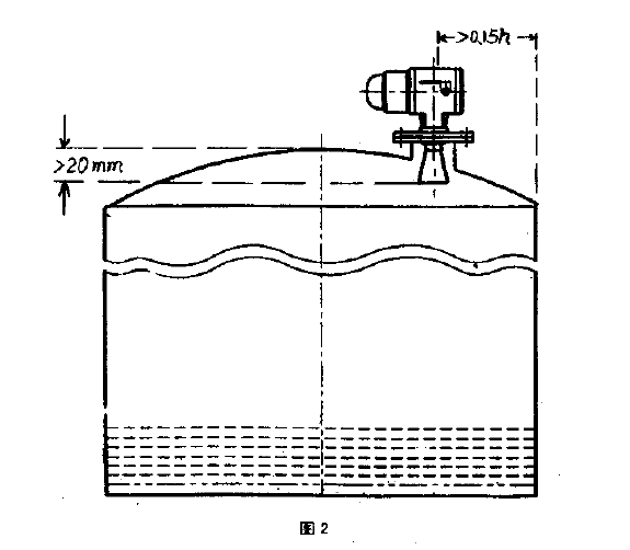 ①喇叭口天線的下端必須低于罐頂20mm以上,法蘭對水平面的誤差應(yīng)小于±0.5°,喇叭天線的中軸線應(yīng)保證與液面垂直,且距罐壁的*小安裝距離不能小于0.15H ( H為罐高)。(如圖2)